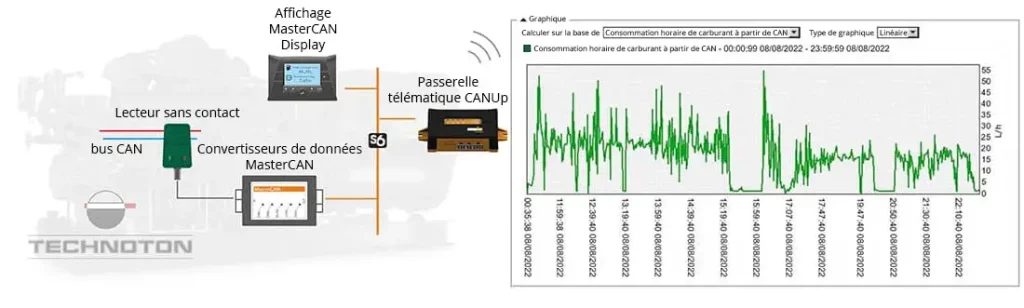 Les modèles avancés de débitmètres de carburant DFM avec l’interface CAN J1939/S6 fournissent plus de 40 paramètres relatifs à la consommation de carburant et au temps de fonctionnement du moteur. Les informations sont stockées dans la mémoire interne du DFM et transmises à une passerelle télématique ou un terminal GPS, puis envoyées à un service télématique en ligne.