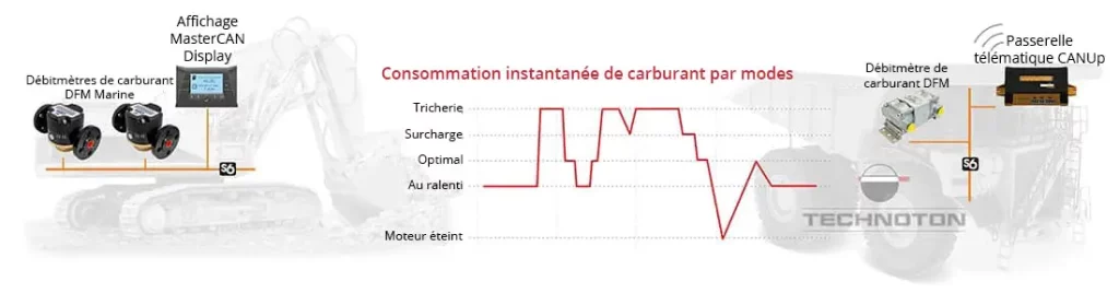 La méthode classique de suivi du fonctionnement des machines repose sur le compteur d’heures moteur. Cependant, cette méthode, ainsi que le calcul de la consommation de carburant basé sur les heures moteur, présente un inconvénient majeur : l’absence d’informations sur les modes de charge du moteur, sur le temps de fonctionnement au ralenti et « à l’usure ».